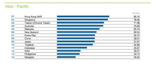 Di kawasan Asia Pasifik, Taiwan menempati peringkat ketiga dengan skor 71,98%.